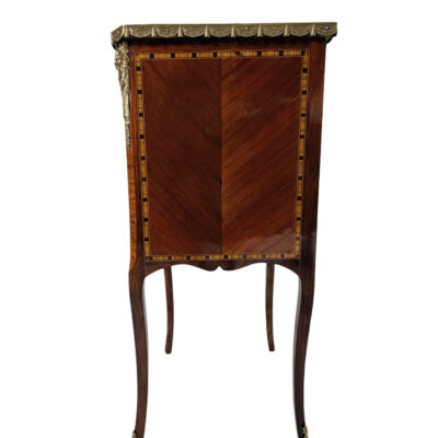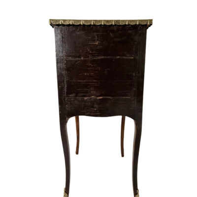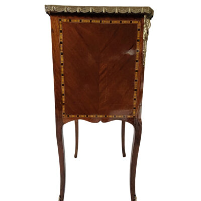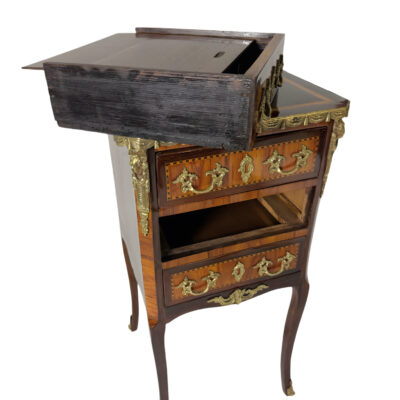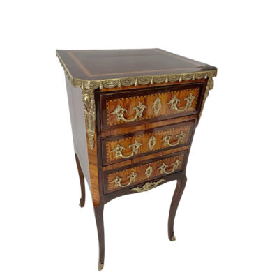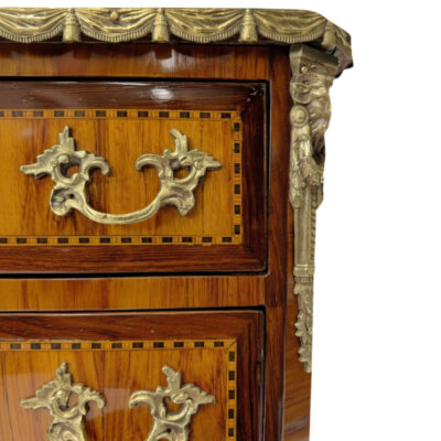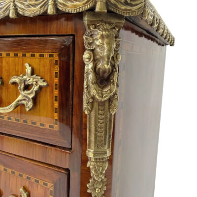 Der Korpus ist in einer feinen Marqueterie aus Rosenholz (Bois de Rose) und Königsholz (Bois de Violette) gearbeitet. Besonders hervorzuheben ist die Verwendung von kontrastierenden Furnieren. Die Front der drei Schubladen zeigt eine geometrische Einlegearbeit, die von feinen Bandelwerk-Intarsien gerahmt wird. Die Seitenwände sind in einer markanten Buch-Furnier-Technik im Fischgrätmuster gestaltet, was dem Möbel eine architektonische Tiefe verleiht. Die Deckplatte ist ebenfalls reich intarsiert und wird von einer umlaufenden, durchbrochenen Galerie aus vergoldeter Bronze gefasst.