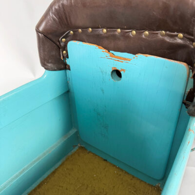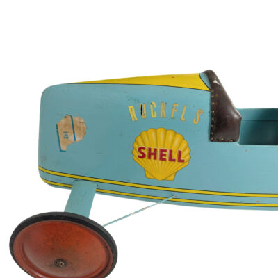Die Karosserie besteht aus eine aerodynamische Zigarrenform, die vollständig aus Holz gefertigt und in einem lebhaften Türkisblau gefasst ist. Der Fahrersitz ist mit einem gepolsterten, braunen Lederbezug ausgestattet, der mit dekorativen Messingnägeln befestigt ist – ein Detail, das an die Polsterungen klassischer Sportwagen erinnert. Das Fahrzeug ruht auf vier schmalen Metallscheibenrädern mit Gummibereifung, die im Kontrast zur Karosserie in einem kräftigen Rot lackiert sind. Die Mechanik im Inneren zeigt die für diese Ära typische Seilzuglenkung.