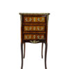 Auf vier schlanken konischen Rundfüßen mit Bronzesabots ruhende untere Zwischenablage, welche vier schlanke, kannelierte Säulen in Fortsetzung der Füße trägt, die den Tischkorpus stützen. In der Tischzarge eingelassene Frontschublade mit Ring-Handhaben und Schlüsselloch-Verblendungen im Louis XVI aus vergoldeter Bronze. Nur eine Konsole verfügt über eine abschließbare Schublade. Als oberer Abschluß dient eine grau-melierte Marmorplatte, die der Demilune-Form des Konsoltisches folgt und mit einer durchbrochen gearbeiteten Bronzegalerie eingerahmt wird.