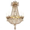 Prachtvoller schwedischer Korb-Kristallleuchter aus dem frühen 19. Jh.: an einem Mittelring aus vergoldeter Bronze vier s-förmig gebogene Leuchterarme mit Dekor von stilisierten Blättern. Vom Mittelring ausgehend werden zahlreiche Kristallketten korbförmig nach unten geführt, nach oben weitere Kristallketten zur oberen Krone kleineren Durchmessers mit ausgelegten Blattvoluten, an welchen Kristallzapfen hängen. Der Kronleuchter erhielt eine nachträgliche 3-flammige Elektrifizierung entlang einer nach innen gelegten Mittelsäule und läßt sich so sowohl für eine elektrische Beleuchtung als auch für eine stimmungsvolle Beleuchtung mit Kerzen nutzen.